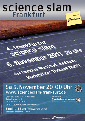 4. frankfurter science slam Samstag, 05.11.2011 Uni Frankfurt Campus Westend / Audimax im Hörsaalzentrum Grüneburgplatz 1, 60323 Frankfurt http://www.scienceslam.physikalischer-verein.de http://www.tickets.physikalischer-verein.de/index.php/home/4-science-slam http://www.muk.uni-frankfurt.de/02_dok/lageplan/Campus_Westend-pdf.pdf